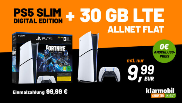 Noch auf der Suche nach einem Playstation 5 Slim Bundle, vielleicht auch als Weihnachtsgeschenk dann könnte das Angebot von klarmobil genau das richtige sein, dort bekommt ihr im Rahmen der Black Week Angebote das Sony Playstation 5 Fortnite Cobalt Star Bundle + 30GB Allnet-Flat im Vodafone-Netz für 9,99€/Monat + 99,99€ Zuzahlung.