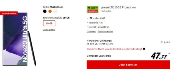 Fazit: Hier bekommt ihr das Galaxy Note 20 Ultra 5G mit 10GB LTE + Telefon-Flat im Vodafone-Netz mit ~191€ Ersparnis gegenüber dem Einzelkauf.