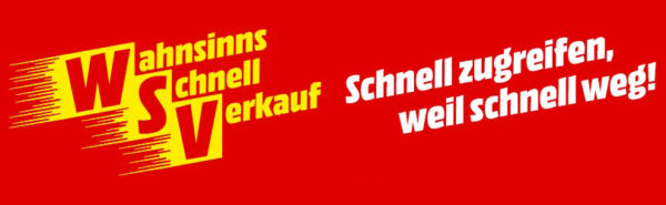 Bei MediaMarkt ist gerade wieder die WSV-Aktion (Wahnsinns Schnell Verkauf) gestartet. Hier erwarten euch, bis einschließlich 28. September (20 Uhr) heute Mitternacht insgesamt über ~8.000 Artikel zu attraktiven Angebotspreisen. Zudem gibt es Abend jeweils besondere Angebote, die sogenannten „Abend-Kracher“. Ein regelmäßiger Blick auf dieses Angebot kann sich also durchaus für euch lohnen. 😉