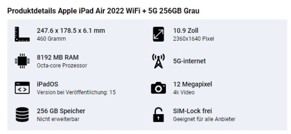 Apple iPad Air 2022 WiFi + 5G 256GB für 603,95€
