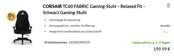 Denn bei Expert bekommt man den Corsair TC60 Fabric Gaming-Stuhl für 199,99€ (Vergleichspreis: ~260€) Ersparnis ~60€