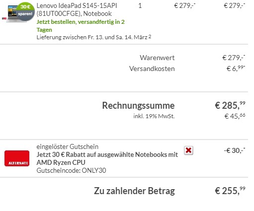 Bei Alternate bekommt ihr gerade das Lenovo IdeaPad S145-15 – 15,6″ Full HD matt, AMD Ryzen 3 3200U, 8GB RAM, 256 GB SSD, Wlan ac, HDMI für 255,99€ (Vergleichspreis ~316€) Ersparnis ~60€