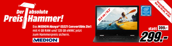 Bei MediaMarkt bekommt ihr heute als Preishammer das MEDION AKOYA E3221 (MD61288), Convertible mit 13.3 Zoll Display, Pentium Prozessor, 4 GB RAM, 128 GB eMMC für 299€ (Vergleichspreis ~403€) Ersparnis ~104€