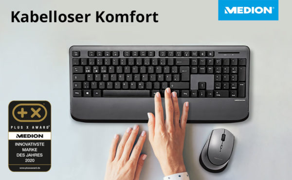 - Lieferumfang: MEDION LIFE MD85014 E81114 Tastatur-/Mausset (inkl. Batterien) QWERTZ, Bluetooth USB Empfänger, Bedienungsanleitung, Garantiekarte