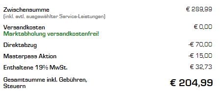 Der Preis ergibt sich durch einen Sofortabzug von 70€ und einer weiteren Gutschrift von 15€ durch Bezahlung mit Masterpass. 🙂
