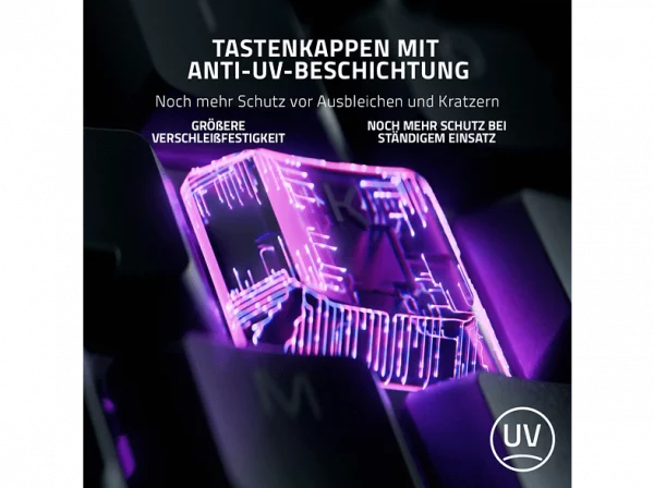 - Tastenkappen mit Anti-UV-Beschichtung Noch mehr Schutz vor Ausbleichen und Kratzern. Diese Tastenkappen sind robuster als herkömmliche Tastenkappen und die Anti-UV-Beschichtung beugt einem Ausbleichen der Beschriftung und vorzeitigem Verschleiß durch häufige Nutzung vor.