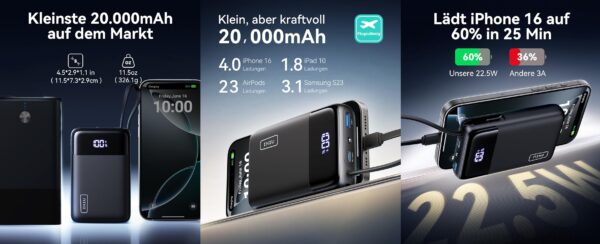 - Einmal Aufladen, Eine Woche Power: Perfekt für Reisende und Outdoor-Fans, die 20.000mAh Powerbank lädt Ihr iPhone 16 bis zu 4 Mal. Einmal aufladen und die ganze Woche über Strom haben!
