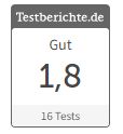 4,1 von 5 Sterne. Bei Testberichte.de wird die Note „gut“ (1,8) bei 16 vorliegenden Tests vergeben.