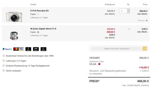 Gebt dann den Gutscheincode olga ein, dann wird der Preis reduziert und das weitere Objektiv automatisch hinzugefügt.