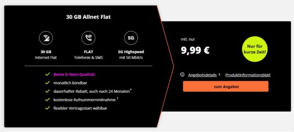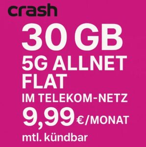 Stark! Neuer Deal von Crash, dort könnt ihr euch die 30GB 5G Alles-Flat im Telekom-Netz für 9,99€/Monat (mtl. kündbar) sichern.