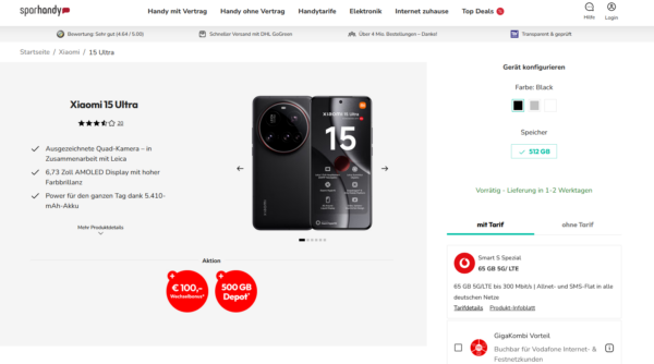 Ein gutes Tarifangebot von Sparhandy zum Wochenende. Denn dort gibt es das Xiaomi 15 Ultra mit dem Vodafone Smart S Spezial für 39,99€/Monat + Zuzahlung.