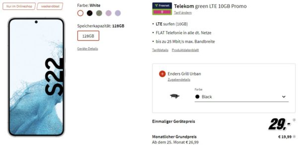 Krasses Angebot! Bei MediaMarkt gibt es das beliebte Samsung Galaxy S22 + Enders Gasgrill + 10 GB Telekom AllnetFlat für eff. -5,55€/Monat!
