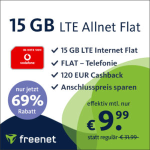 Bei freenet erhaltet ihr als Touchdown-Deal bis einschließlich Montag, 13. Februar eine 15 GB LTE AllnetFlat (VF) für eff. 9,99€/Monat.