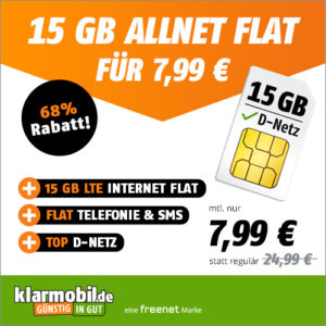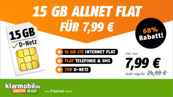 Noch auf der Suche nach einem SIM-Only Tarif? Bei klarmobil bekommt ihr den 15GB LTE + Alles-Flat im Vodafone-Netz für 7,99€/Monat inkl. VoLTE / eSIM