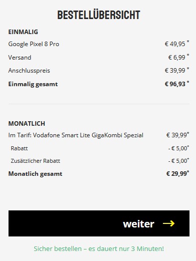 - Pixel 8 Pro 256 GB für 149,95 € Zuzahlung im Tarif Vodafone Smart Lite Spezial für mtl. 34,99€ (mit Gigakombi-Vorteil nur 29,99€/Monat) mit 35 GB 5G/LTE (45GB bei Giga/Young-Vorteil) + Anschlussgebühr: 39,99€ + MNP-Bonus: 200€ – auch mit Gigakombi- und Young Vorteil