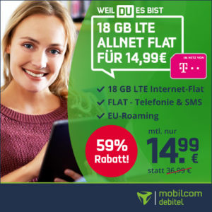 Bei Mobilcom-Debitel gibt es nur für kurze Zeit eine 18GB Telekom LTE AllnetFlat für 14,99€/Monat!