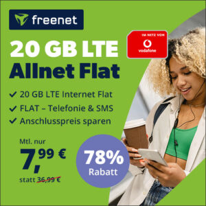 Alle Tarifsuchenden aufgepasst! Es wird mal wieder Zeit für einen richtigen Kracher! Bei freenet erhaltet ihr nun eine 20 GB LTE AllnetFlat im Vodafone-Netz für 7,99€/Monat. 🙂