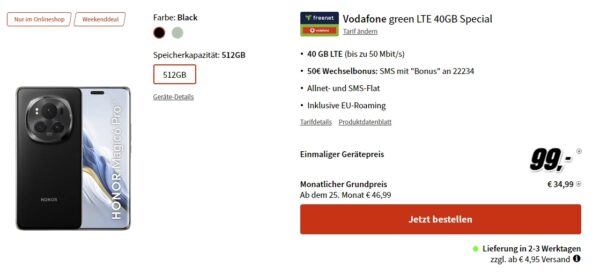 Beu MediaMarkt gibt es das Honor Magic 6 Pro 5G + 40 GB LTE AllnetFlat (VF) für eff. -8,35€/Monat!
