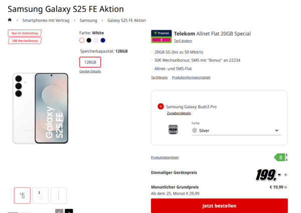 Starker Deal seitens MediaMarkt, dort bekommt ihr das Samsung Galaxy S25 FE + 20GB 5G + Alles-Flat im Telekom-Netz für 19,99€/Monat + Zuzahlungen.
