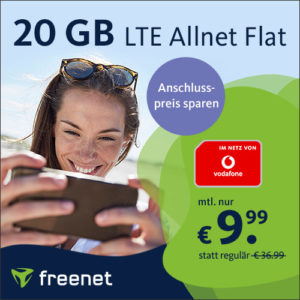 Alle Tarifsuchenden aufgepasst! Es wird mal wieder Zeit für einen richtigen Kracher! Bei freenet erhaltet ihr nun eine 20 GB LTE AllnetFlat im Vodafone-Netz für 9,99€/Monat. 🙂