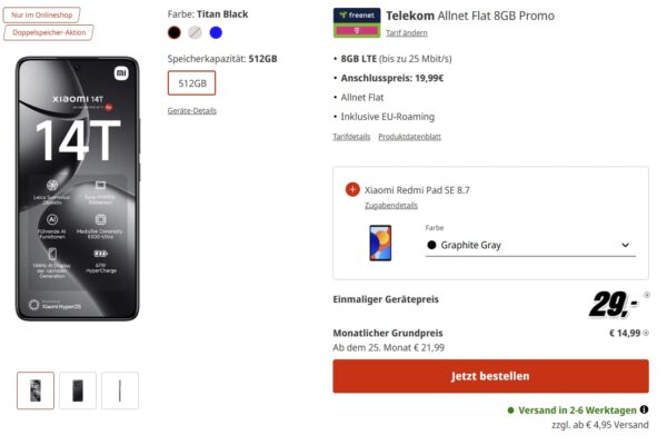 *210€ ERSPARNIS* XIAOMI 14T + 8 GB Telekom LTE AllnetFlat für eff. -8,76€/Monat