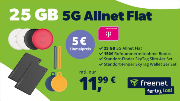 ⏰ 25 GB 5G Telekom Allnet-Flat + Sky Tag 2er + Sky Tag Slim 4er für 11,99€/Monat – eff. 2,74€/Monat