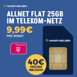 Aufgepasst! ☝🏻 Bei Handyhelden erhaltet ihr nun eine 25GB 5G Allnet-Flat im besten Netz der Deutschen Telekom + 40€ Zubehör Gutschein für 9,99€/Monat!