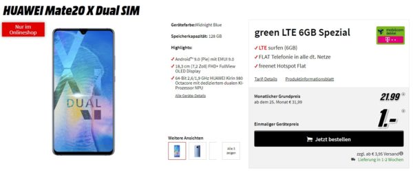Bei MediaMarkt bekommt ihr gerade das Huawei Mate 20X + 6 GB LTE im Telekom-Netz für 21,99€/Monat