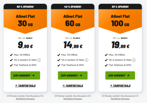 Es gibt die Allnet-Flats mit 30GB/60GB und 100GB und unter anderem auch monatlich kündbar (leider 2€/Monat teurer, aber dafür ohne die 29,99€ Anschlusspreis!) 🙂