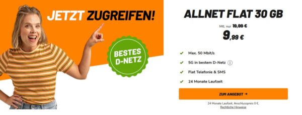 30GB 5G + Allnet-Flat im Telekom-Netz ab 9,99€/Monat