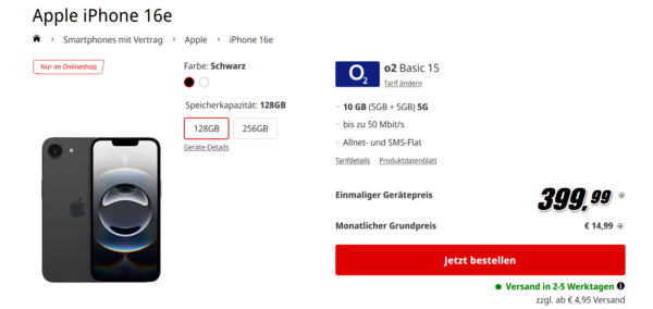 Doch nun gibt es auch das iPhone 16e 128 GB mit o2 Basic 10 GB 5G Allnet-Flat für effektiv 504,69€ über 24 Monate!