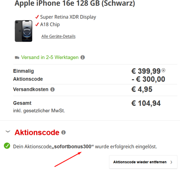 Denn es gibt einen Aktioncode mit dem ihr satte 300€ spart.