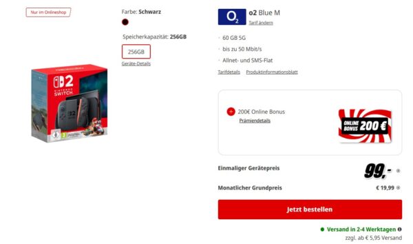 *55€ UNTER IDEALO + 200€ CASHBACK* Nintendo Switch 2 MK + 60GB 5G + Alles-Flat im o2-Netz für 19,99€/Monat