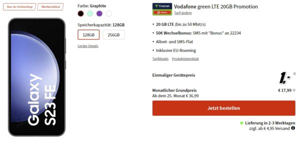 *97€ ERSPARNIS* Samsung Galaxy S23 FE + 20 GB LTE AllnetFlat (VF) für eff. – 4,05€/Monat