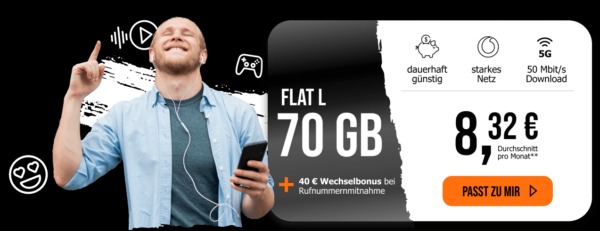 - Flat L 9,99€ / 70GB / 40€ WB / eff. 8,32€ allmobil Flat L Black Week Vodafone