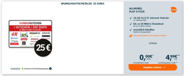 💥 *KNALLER* 5 Monate Gratis! Allmobil 10GB 5G + Alles-Flat VF für 4,99€/Monat (mtl. kündbar) + 25€ Wunschgutschein
