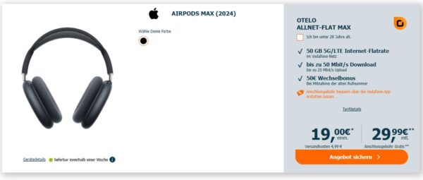 Bei LogiTel bekommt ihr die Apple AirPods Max (2024) + 50GB 5G + Alles-Flat im VF-Netz für 29,99€/Monat