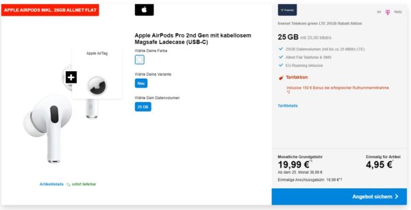 Apple AirPods Pro 2nd Gen + Airtag + 25GB + Alles-Flat im Telekom-Netz für 19,99€/Monat – eff. 3,78€/Monat + 150€ Bonus