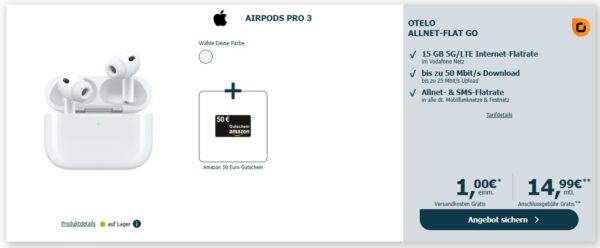 Schöner Deal seitens LogiTel, dort bekommt ihr das Apple AirPods Pro 3 + 50€ Amazon Gutschein* + 15GB 5G + Alles-Flat im Vodafone-Netz für 14,99€/Monat