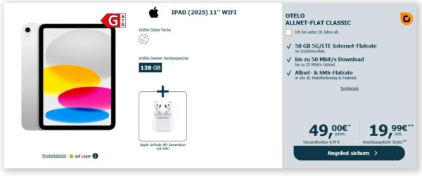 Neuer Deal seitens LogiTel, dort bekommt ihr das Apple iPad 2025 128GB WiFi + Apple AirPods 4th Gen. + 50GB 5G + Alles-Flat im Vodafone-Netz für 19,99€/Monat