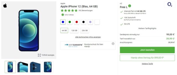 Bei DeinHandy bekommt ihr das Apple iPhone 12 (64GB) + 60 GB LTE + Alles-Flat im o2-Netz für 39,99€/Monat