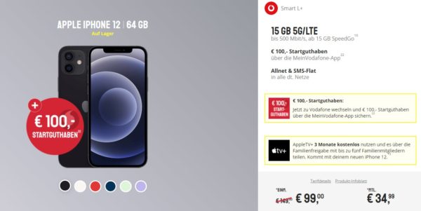 Apple iPhone 12 (99€) + 15 GB LTE + Alles-Flat im Vodafone-Netz für 34,99€/Monat – Effektiv 11,72€/Monat