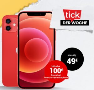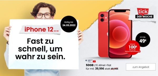 Bei handytick bekommt ihr als tick der Woche das Apple iPhone 12 (für 49€) + 50 GB LTE + Alles-Flat im Vodafone-Netz für 39,99€/Monat