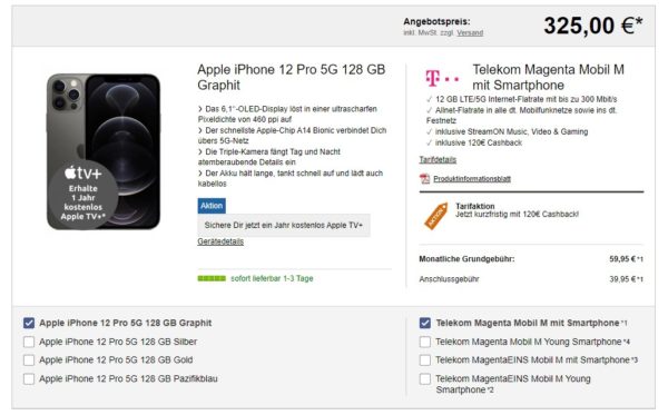 Apple iPhone 12 Pro 5G 128 GB + 12 GB LTE + Alles-Flat + StreamON + 120€ Cashback + Hotspot-Flat im Telekom-Netz für 59,95€/Monat – Effektiv 24,57€/Monat