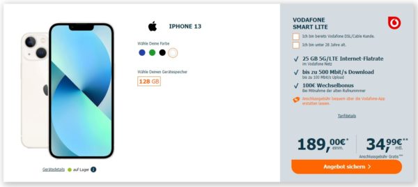 Apple iPhone 13 + 25GB LTE + Alles-Flat im Vodafone-Netz für 34,99€/Monat – Eff. 5,61€/Monat