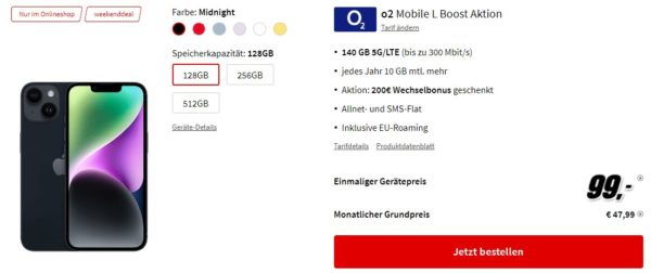 Starker Weekend-Deal von MediaMarkt, dort bekommt ihr das Apple iPhone 14 + 140GB LTE (jedes Jahr 10GB mtl. mehr) + Alles-Flat im o2-Netz für 47,99€/Monat