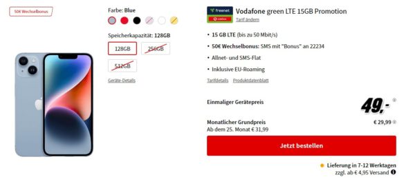 Bei MediaMarkt bekommt ihr das Apple iPhone 14 + 15GB LTE + Telefon-Flat im Vodafone-Netz für 29,99€/Monat