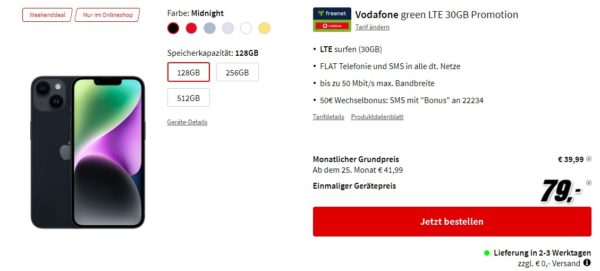 Bei MediaMarkt bekommt ihr als Weekenddeal das Apple iPhone 14 + 30 GB LTE + Alles-Flat im Vodafone-Netz für 39,99€/Monat
