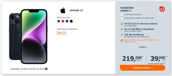 Apple iPhone 14 + 50 GB LTE + Alles-Flat im Vodafone-Netz für 39,99€/Monat – eff. 8,32€/Monat