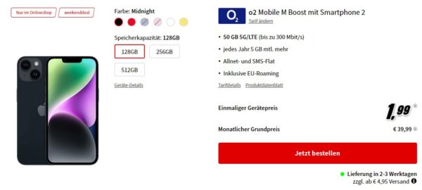 Schönes Angebot von MediaMarkt, dort bekommt ihr bis maximal Montag 9 Uhr das Apple iPhone 14 + 50GB LTE/5G + Alles-Flat im o2-Netz für 39,99€/Monat